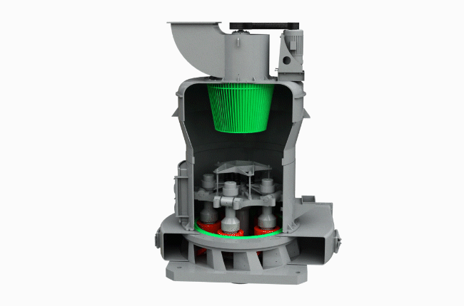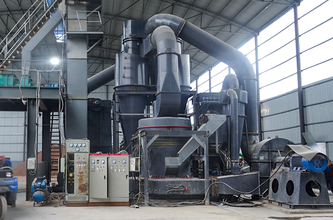 大塊石料在破碎機充分破碎后,由斗式提升機送至儲料斗,之后由電磁振動給料機有序送至主機內研磨。主機內懸掛于梅花架上的磨輥裝置繞中心軸旋轉,磨輥同時繞磨輥軸自轉,在離心力的作用下,磨輥向外擺壓緊磨環,旋轉的鏟刀鏟起的物料被拋向輥環之間,因磨輥的滾碾以達到粉碎和研磨作用。磨碎室的粉末被鼓風機的氣流吹到主機上方的分析機進行分析,細度過粗的石粉由于自重則落入主機內重磨,合格細粉則隨風流進入到大旋風收集器,收集后經出料管排出即為成品。