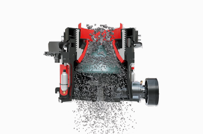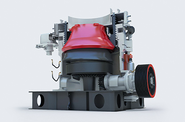 在工作時通過電動機(jī)的旋轉(zhuǎn)帶動帶輪或聯(lián)軸器、傳動軸和圓錐部在軸心線下使偏心軸做周期性旋擺運動。在物料從料口進(jìn)入破碎腔后因受到偏心軸和軋臼壁的相互沖擊擠壓、研磨、揉搓從而產(chǎn)生破碎的作用。液壓保險系統(tǒng)能在機(jī)器發(fā)生過鐵故障或者悶車現(xiàn)象時通過液壓將支撐套和定錐部排除出故障物,在起到很好的保險作用的同時大大的降低了維修率及提高生產(chǎn)效率。