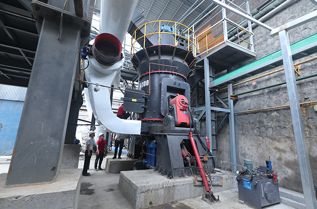 主電機通過減速機帶動磨盤轉動,固定的磨輥沿磨盤滾道自轉。物料從下料口落在磨盤中央,在離心力的作用下,物料從磨盤中央向邊緣勻速移動,經過粉磨滾道時,受到磨輥的碾壓,碾磨力由液壓加載系統提供,大塊物料直接被壓碎,細粒物料受擠壓后形成料床進行粒間粉碎。烘干與粉磨同時進行,一次熱風通過風環均勻進入磨盤周圍,將經過輾磨從磨盤上切向甩出的粉碎物料烘干并輸送到上部選粉機處,在轉子葉片的作用下,粗顆粒重新回到磨盤上粉磨(內循環),合格的細粉隨氣流一起出磨,被系統集粉器收集,即為成品;少部分難粉碎且一次風吹不起的較大顆粒、雜質等通過風環跌落至磨機下部一次風室被刮料裝置排出機外,或經輸送設備由進料口進入立磨重新粉磨(外循環)。