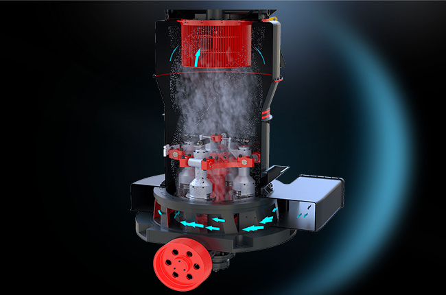 該機結構主要由主機、分析器、風機、成品旋風分離器、微粉旋風分離器及風管組成。其中,主機由機架、進風蝸殼、鏟刀、磨輥、磨環、罩殼組成。雷蒙機工作時,將需要粉碎的物料從機罩殼側面的進料斗加入機內,依靠懸掛在主機梅花架上的磨輥裝置,繞著垂直軸線公轉,同時本身自轉,由于旋轉時離心力的作用,磨輥向外擺動,緊壓于磨環,使鏟刀鏟起物料送到磨輥與磨環之間,因磨輥的滾動碾壓而達到粉碎物料的目的。